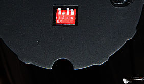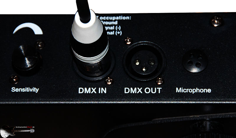 - Musiksteuerung: Das eingebaute Mikrofon reagiert (je nach Einstellung der Empfindlichkeit mittels Drehregler) auf die Musik und schaltet die Vorgabe-Pattern passend zum Bass um. Die Empfindlichkeit ist jedoch sehr von der Musiklautstärke abhängig und kann nur an der Rückseite des Querträgers reguliert werden. Bei Montage auf einem Lichtstativ in drei Meter Höhe kann das problematisch werden.