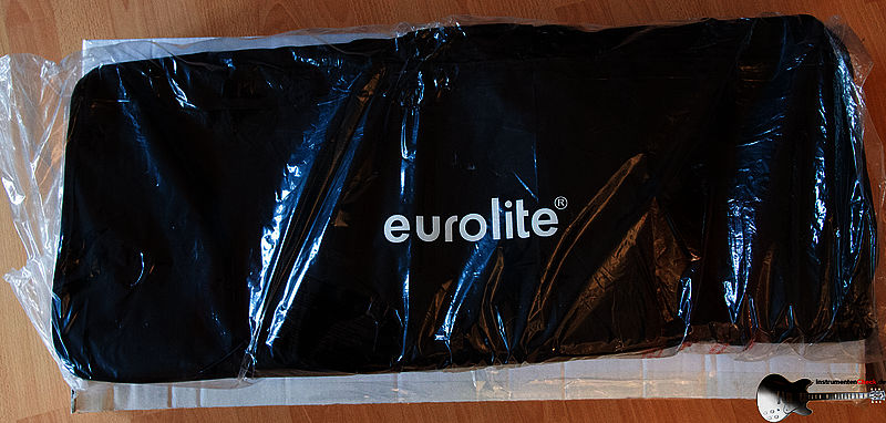 Die Lichtanlage wird in einem einfachen Pappkarton geliefert. Darin befindet sich das Softcase (zusätzlich in Plastikfolie). Das Softcase besitzt einen umlaufenden Reißverschluss und drei Kunststoffelemente, die zwischen den Leuchten für Sicherheit sorgen sollen. Zusätzlich ist jede Lampe mit einem Schaumstoff-Formelement geschützt. Da das Case seinem Namen wirklich Ehre macht (es ist sehr "soft"), sollten diese Verpackungsmaterialien aufbewahrt werden, um die Linsen beim Transport zu schützen. Ein Kaltgeräte Kabel liegt dem Paket bei, ist aber mit ca. 1,8 Meter Länge für die Installation auf einem höheren Stativ viel zu kurz. Eine gedruckte Anleitung liegt ebenfalls bei.